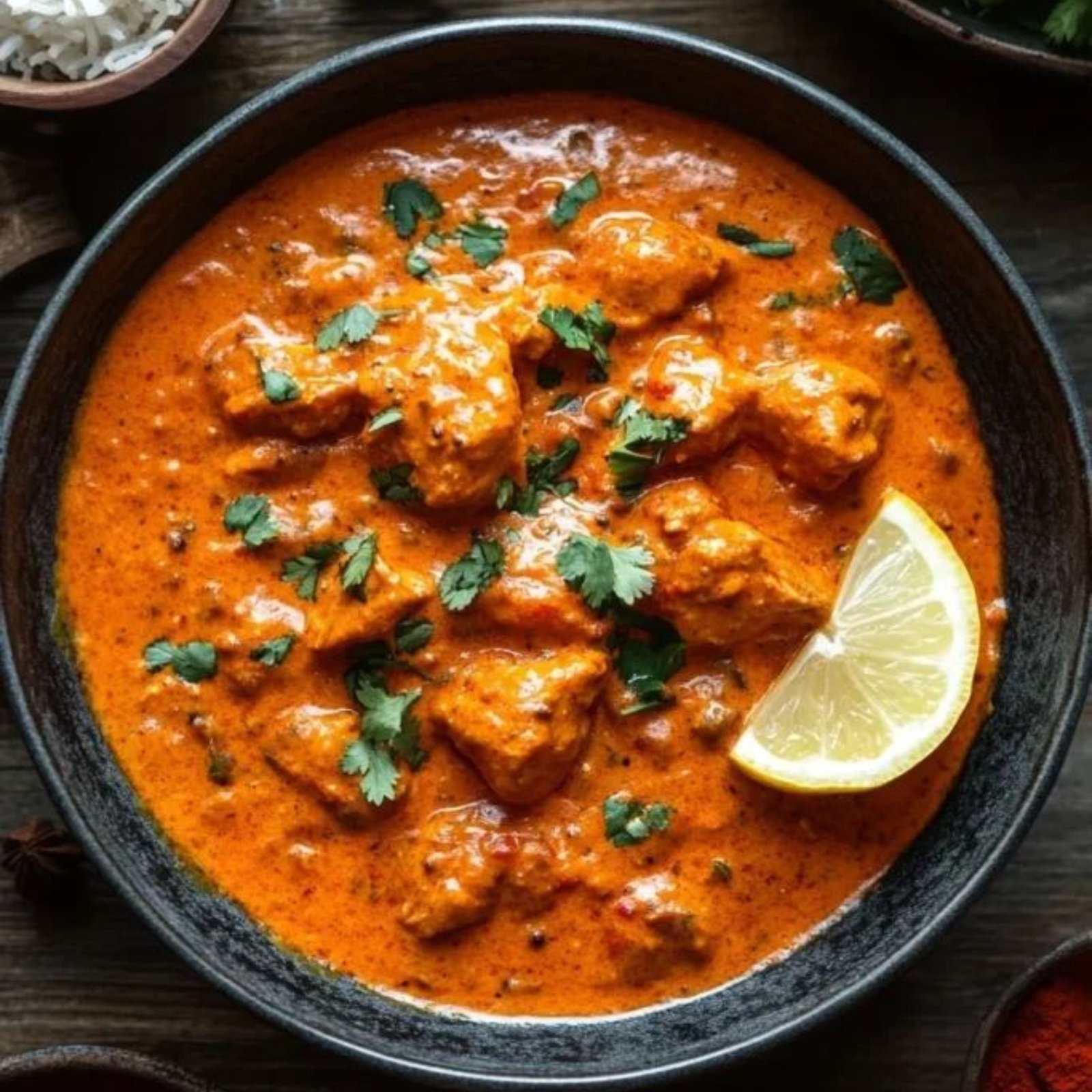 Shredded Tandoori chicken in tomato, butter, and fenugreek sauce.