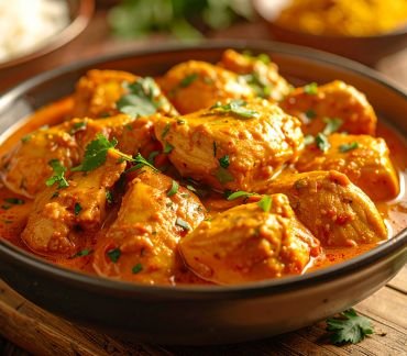 Boneless pieces of chicken in curry sauce.