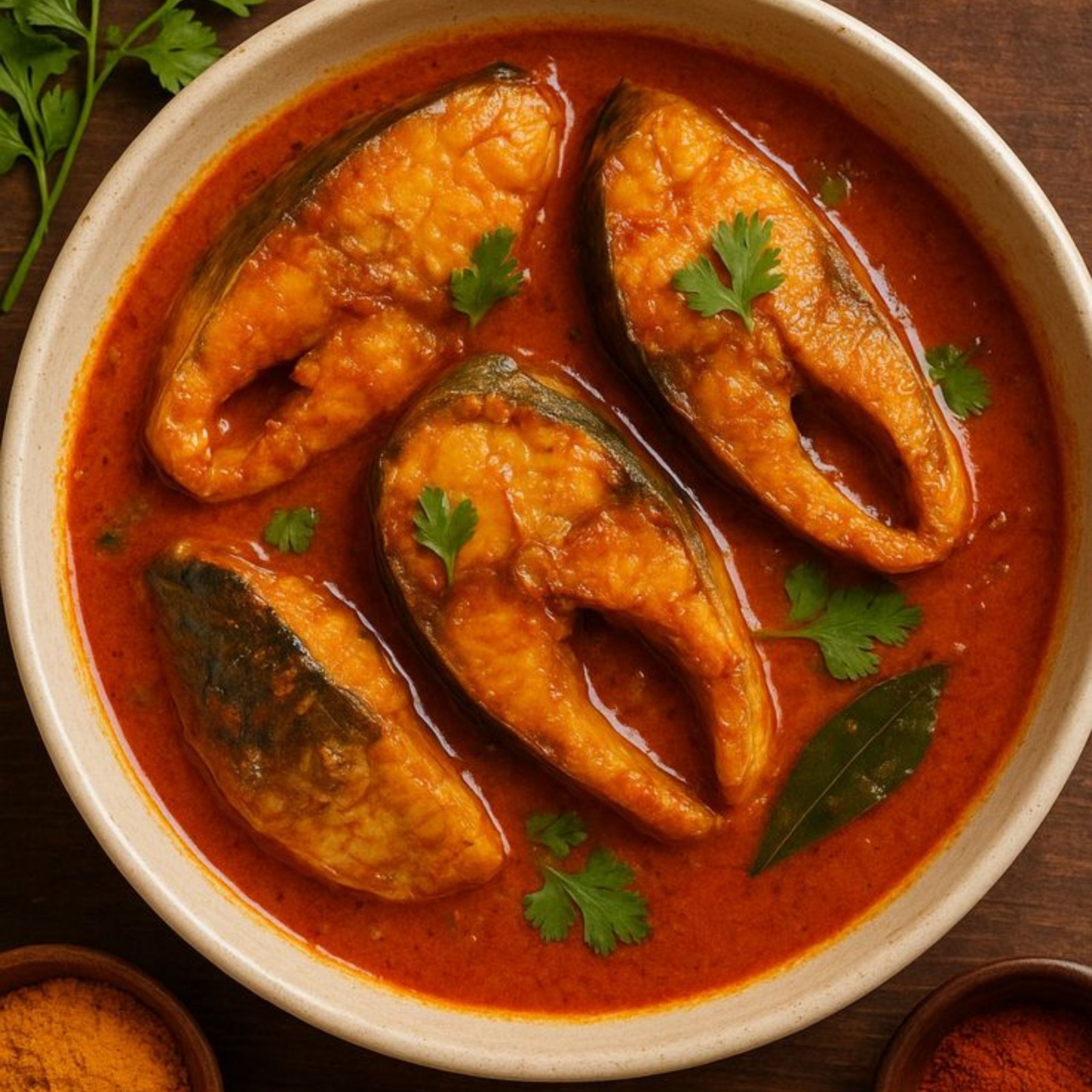 Pieces of cod marinated and cooked in spices and tomato sauce.