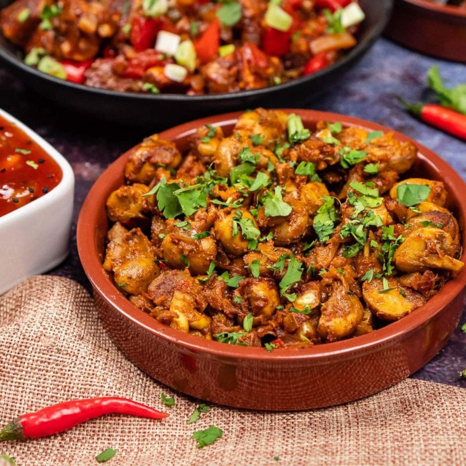 Slices of mushrooms cooked with onions and spices.
